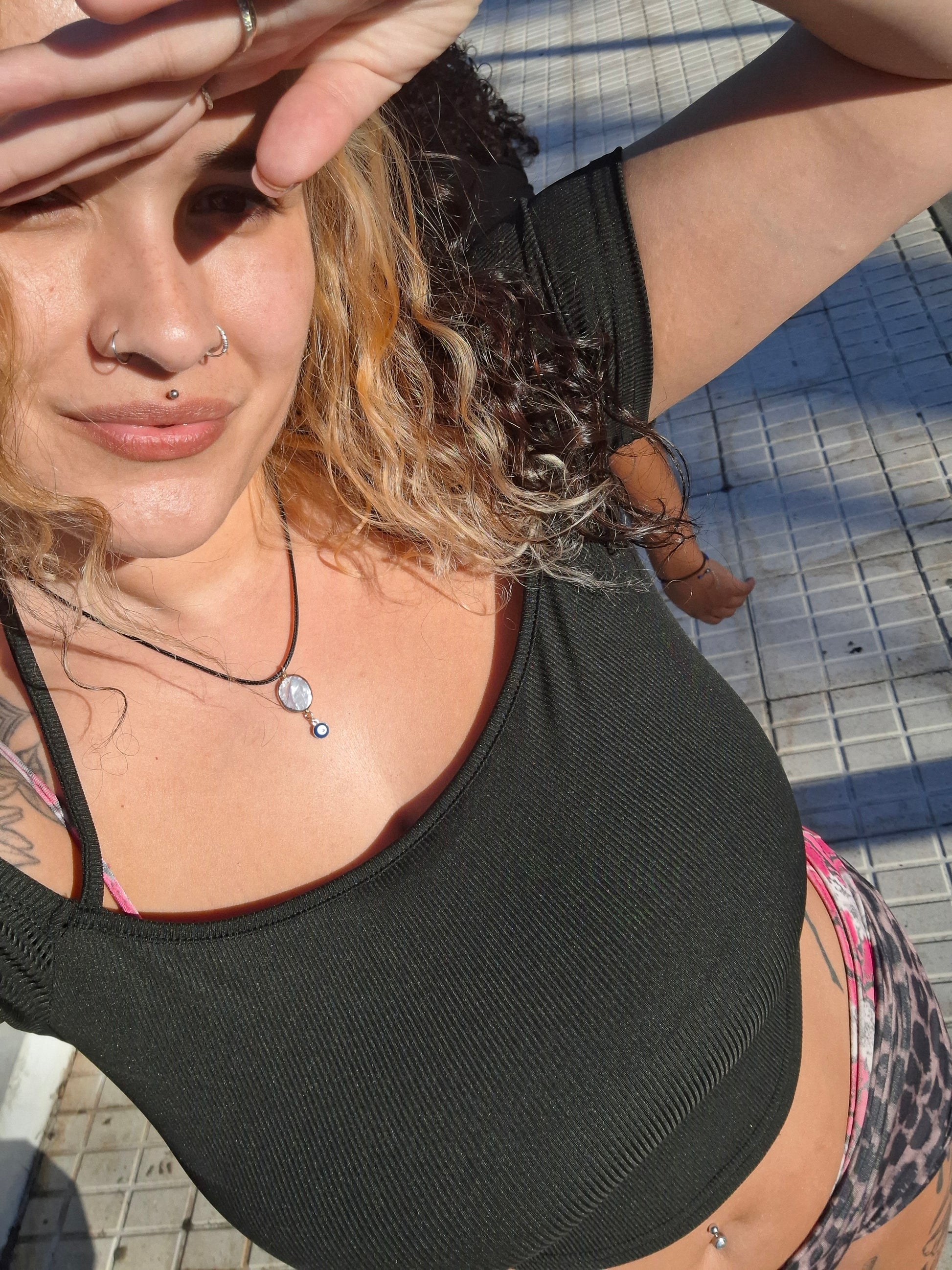 crafted under sun kissed skies, this necklace pairs the gentle, lunar glow of mother of pearl with the protective power of the blue evil eye.🪬🧿